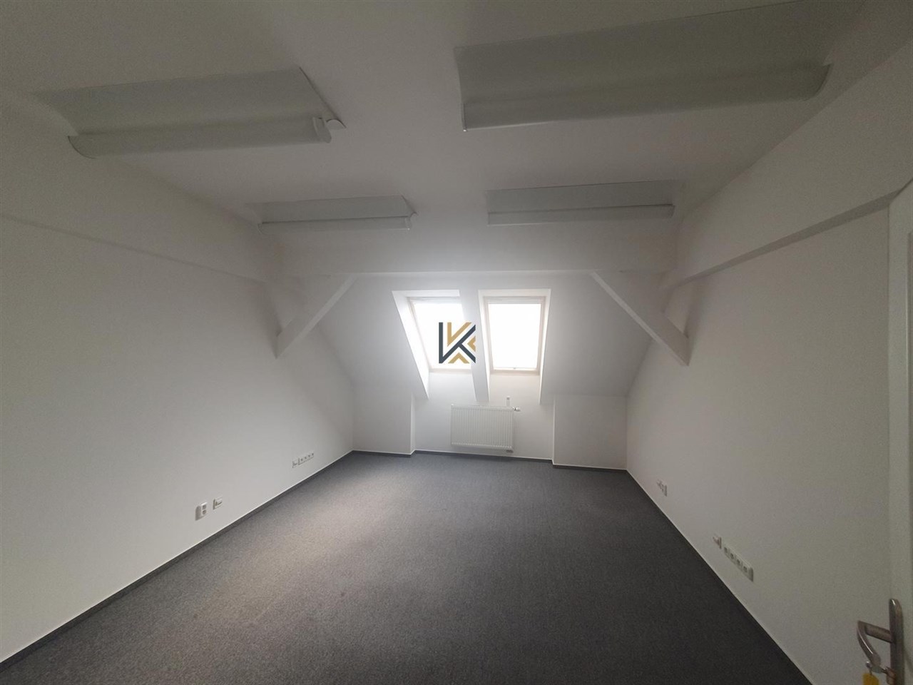 Kancelář o výměře 22 m2. Kuchyňka a toalety jsou společné na patře.