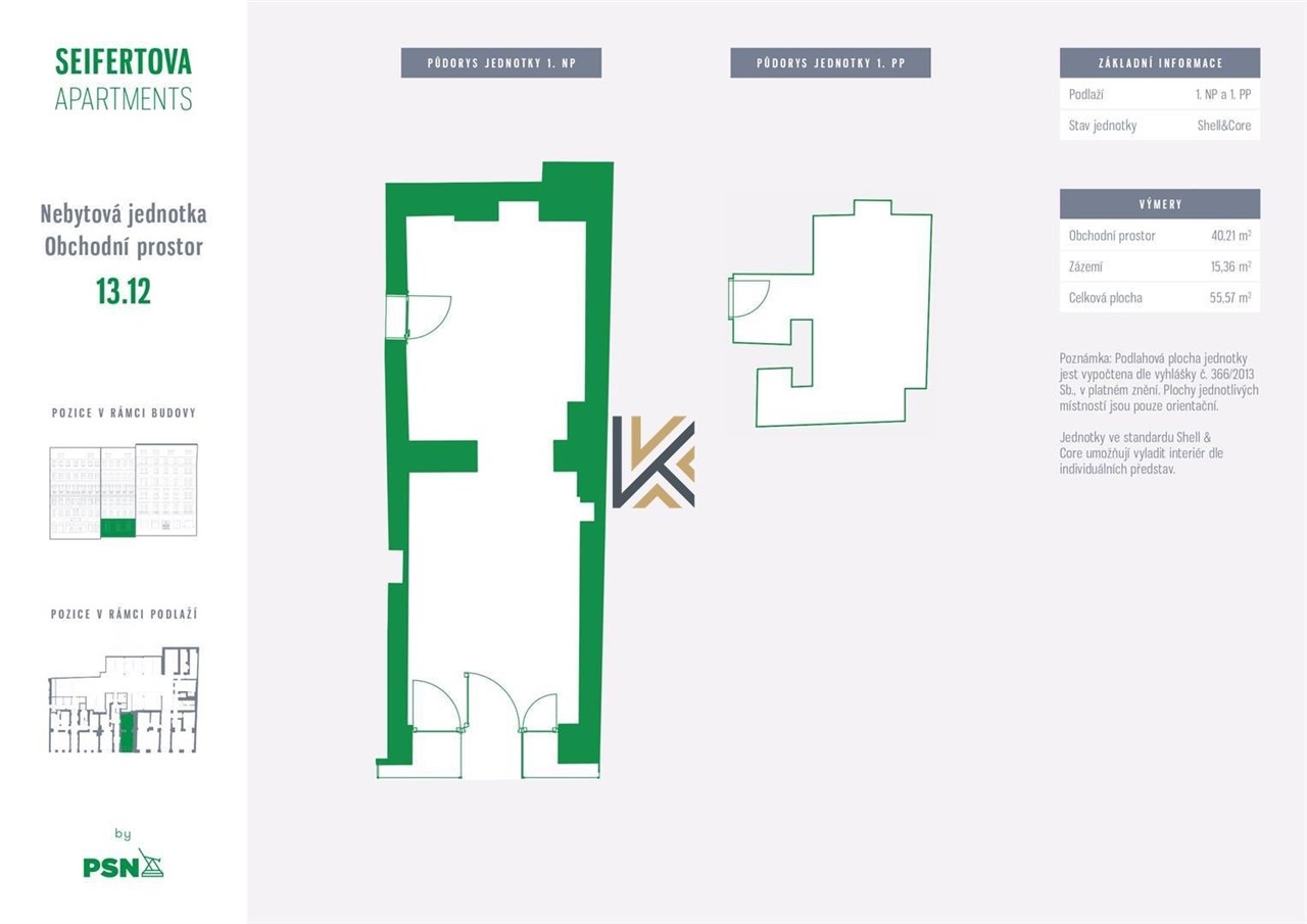 Obchodní prostory 40 m2 + 15 m2 zázemí ve stavu shell & core